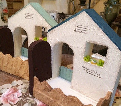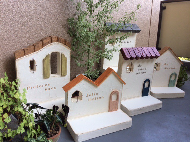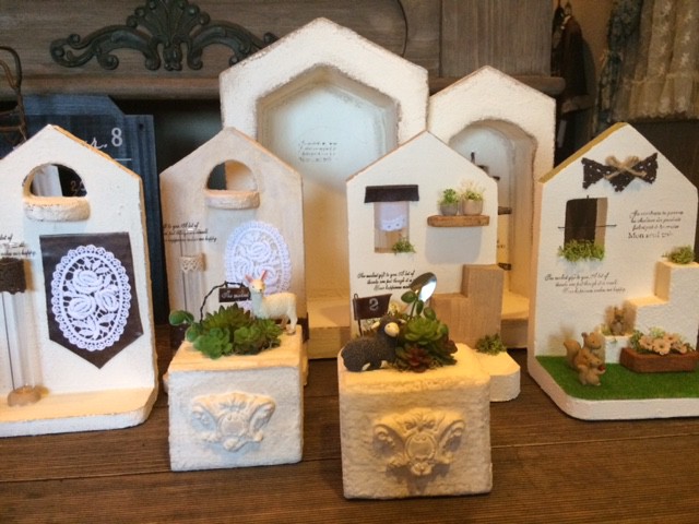 発泡スチロールで作ったお家の土台に材料をコテで塗って仕上げるワークショップです。