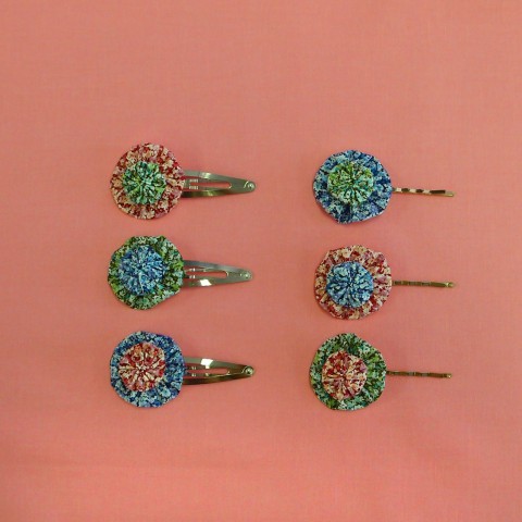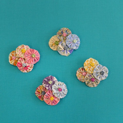 ヨーヨーキルトを作り、ブローチまたはヘアアクセサリーお好きな方を選んで仕上げます。ヨーヨーキルトは、まあるくカットした生地をぐしぐし縫うだけ。簡単にできますよ!