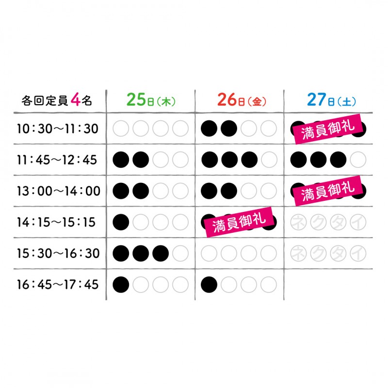 25日 11時45分〜12時45分(当日受付) 25日 13時00分〜14時00分(当日受付) 25日 14時15分〜15時15分(当日受付) 25日 15時30分〜16時30分(当日受付) 25日 16時45分〜17時45分(当日受付)