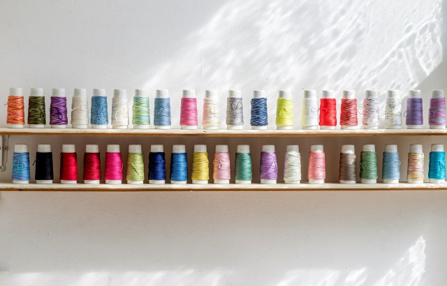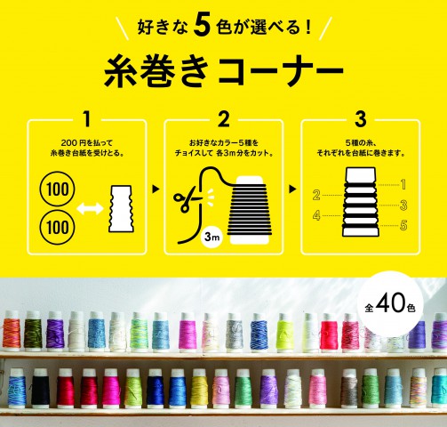 ・刺し子糸全40色からお好きな色5種を3mずつ専用の台紙に巻いて持ち帰れます。1回200円(税込)