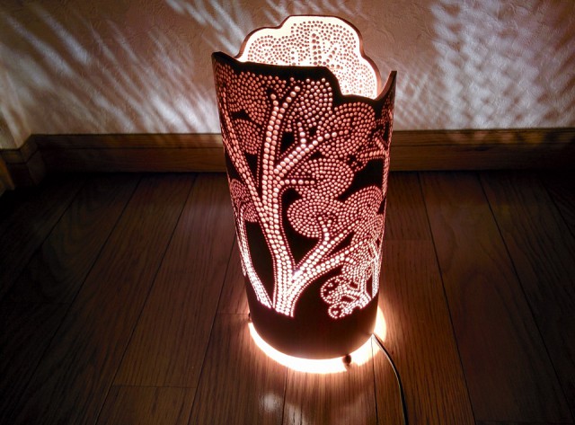 5ミリの薄さまで削ることで、自然の割れを防ぐとともに細かい彫りも実現しました。