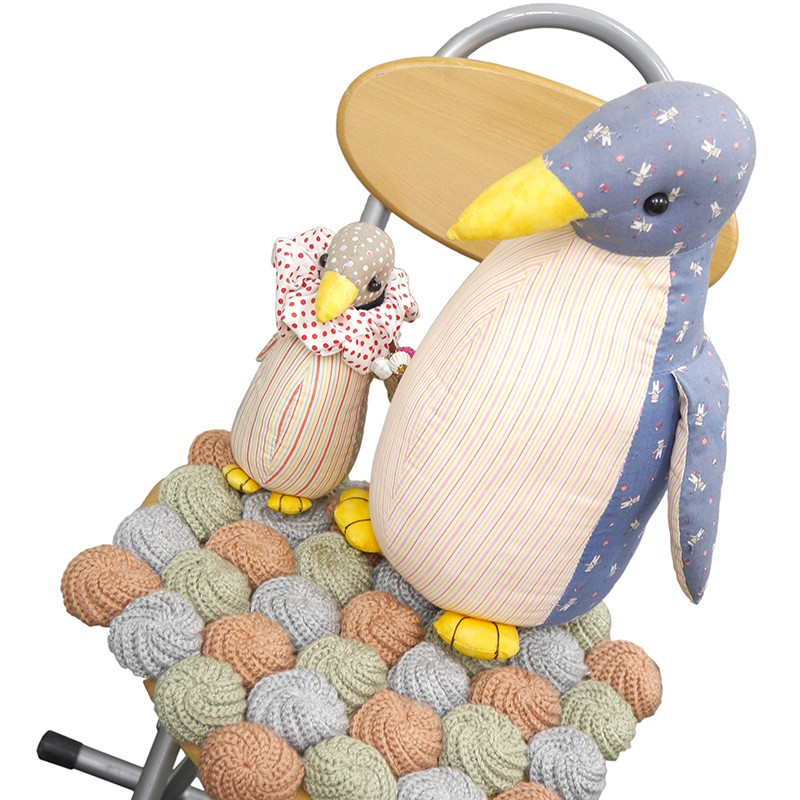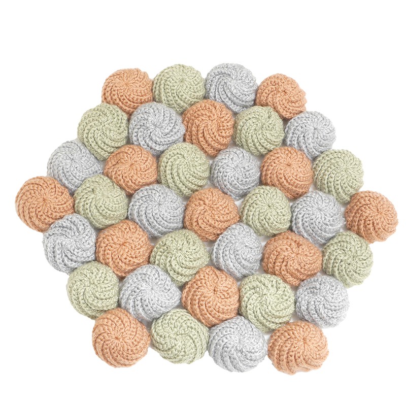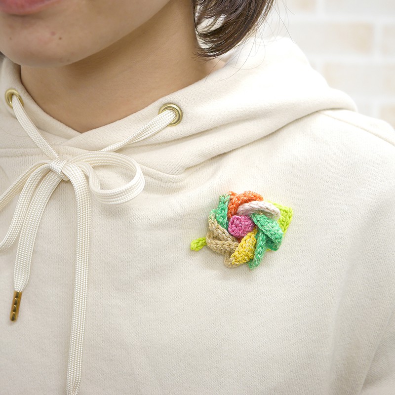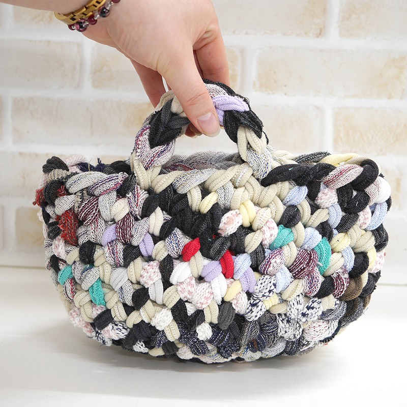 靴下を生産する際に出るハギレ、「ポイット」を使用して編むミニバッグを作ります。